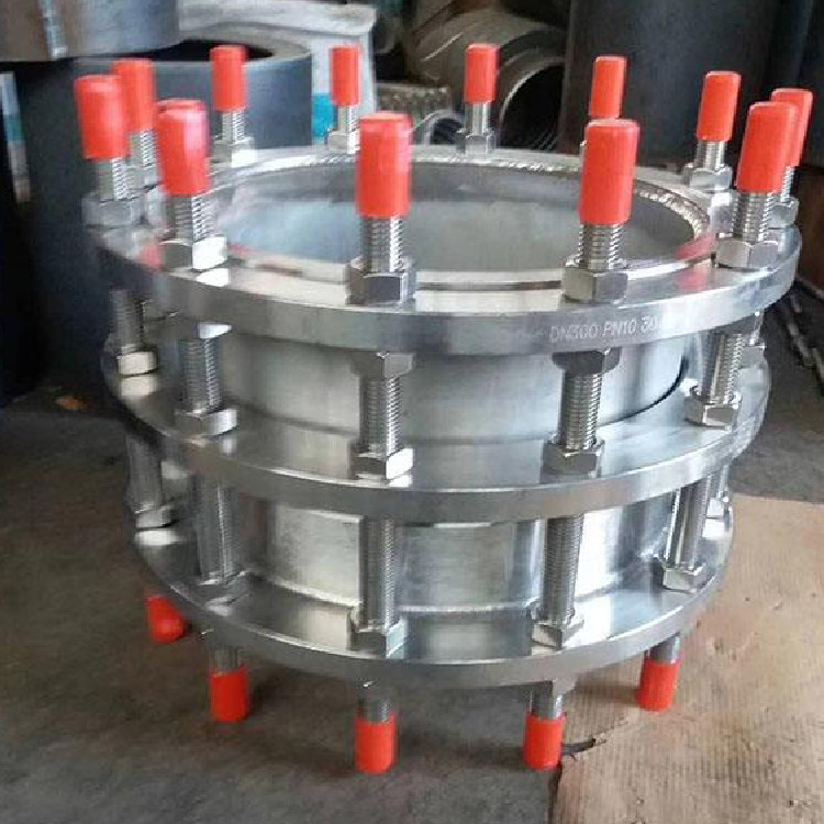 雙法蘭限位伸縮接頭在管道運(yùn)行中有一定的多向位移作用,對管道在運(yùn)行中由于熱漲冷縮、地殼下陷和受力產(chǎn)生著重要的伸縮補(bǔ)償作用,因此,伸縮接頭可以緩解管道運(yùn)行中的盲板推力,對管道起到一定的保護(hù),特別是對管道的安裝和維修提供了極大的便利。但是,在水泵出口處和管道轉(zhuǎn)角處,在無固定支墩、無限位支墩和定向限位支墩支架的滑動管道連接中應(yīng)采用傳力接頭和限位傳力接頭,或采用限位伸縮器和防拉脫限位橡膠接頭,以及可采用限位伸縮接頭及卡箍柔性接頭,因?yàn)閭髁宇^通過傳力螺栓(即全絲螺栓)能把啟泵時的盲板推力傳導(dǎo)到泵和管道各部位,避免推力集中于管道轉(zhuǎn)角處或泵的近端,發(fā)生沖擊力損傷設(shè)備。